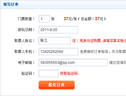 請?zhí)顚懻鎸嵢∑比诵彰?、?shù)量、證件類型內請選擇預訂人有效證件類型,手機號碼請?zhí)顚懭∑比耸謾C號碼,E-mail下是可選填寫,填寫結束后提交訂單。(注:帶*號為必填項)