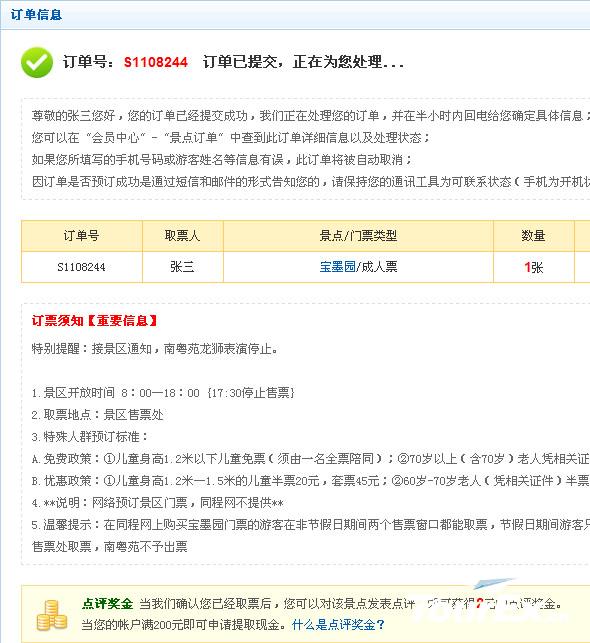 提交訂單后,表示您的訂單已提交至本網(wǎng),請直接憑收到的手機短信前程景區(qū)指定取票點取票入園游玩。