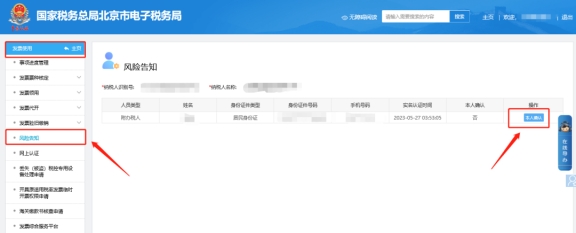 請(qǐng)您點(diǎn)擊【我要辦稅】—【發(fā)票使用】—【風(fēng)險(xiǎn)告知】進(jìn)入雙向?qū)嵜J(rèn)證模塊(此處只顯示當(dāng)前登錄人員的信息,所以需要給誰(shuí)做雙向?qū)嵜J(rèn)證,則需要使用該人員的信息驗(yàn)證登錄);點(diǎn)擊【本人確認(rèn)】后彈出“實(shí)名制涉稅風(fēng)險(xiǎn)提示告知書(shū)”,確認(rèn)信息后點(diǎn)擊【相符】則可進(jìn)行生物識(shí)別驗(yàn)證;在生物識(shí)別驗(yàn)證界面可使用“北京稅務(wù)APP/個(gè)人所得稅APP”掃描二維碼進(jìn)行人臉識(shí)別,人臉識(shí)別成功后點(diǎn)擊【確定】即可。