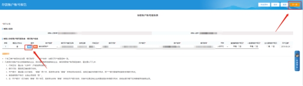 三、存款賬戶賬號報告頁面,增加或修改銀行信息,點擊下一步提交。