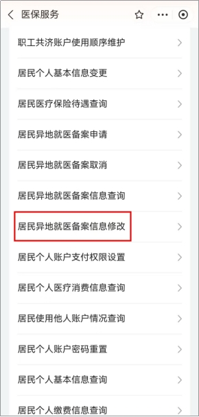 2、請(qǐng)點(diǎn)擊【修改居民異地就醫(yī)備案信息】。